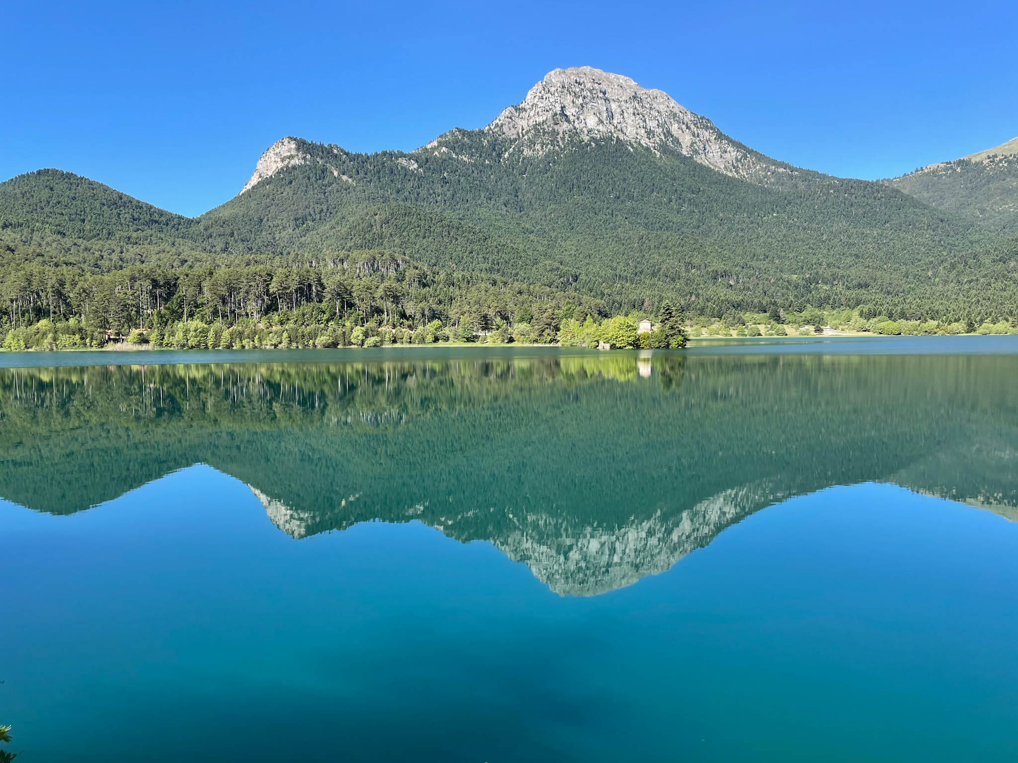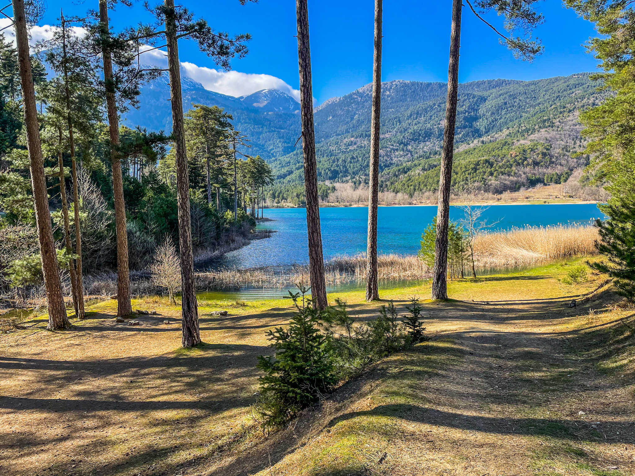 Set against a backdrop of fir-covered mountains and open meadows, Lake Doxa resembles an alpine landscape rather than a typical Mediterranean setting. The calm waters reflect the surrounding peaks, creating a visually striking and ever-changing scenery. Each season offers a different experience — from lush green summers to snowy winter landscapes — making the destination attractive all year round.